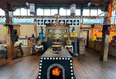 走进帐篷,内部别有洞天。藏式灶台被巧妙地安置在用餐区的中央,灶台上的炊烟袅袅升起,弥漫着家的温馨。灶台旁,落地窗的设计让这里充满了阳光的温暖。阳光洒在餐桌上,照亮了每一道精心准备的佳肴。这种温暖不仅来自阳光的照耀,更来自这里所传递的藏族人民的热情和好客。而除了这些显而易见的元素外,一些小细节也展示了这里独特的民族特色。那些挂在墙上的藏戏面具、陈列展示的彩绘石刻它们都在静静地诉说着藏族文化的丰富多彩。