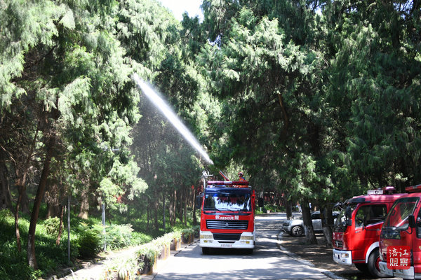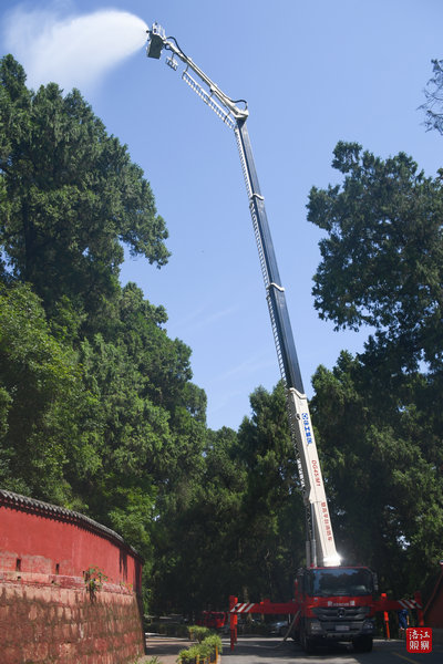 8月14日上午,停靠在七曲山景区林区一宽敞路口的登高平台消防车很是吸睛。记者在现场看到,它的底盘四周固定后,登高平台开始徐徐上升,慢慢越过古柏,“向云端”奔去。连接消火栓后开始源源不断地供水,通过消防管道来到消防车,最后直达最上空喷口,开始给古柏林酣畅淋漓地“淋雨”。据介绍,登高平台消防车每小时可以对50亩森林进行增湿。