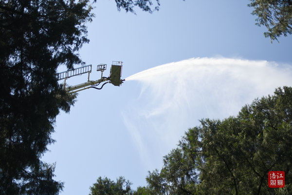 洒水降温“向云端”,高度达45米,射程直径最高达100米!这是8月14日,登高平台消防车在绵阳市梓潼县七曲山景区高空洒水对翠云廊古柏降温增湿的一幕,现场蔚为壮观。