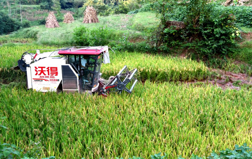 2024年8月7日,在宜宾市江安县夕佳山镇,一台收割机正在农田里收割水稻。新华社记者高健钧 摄