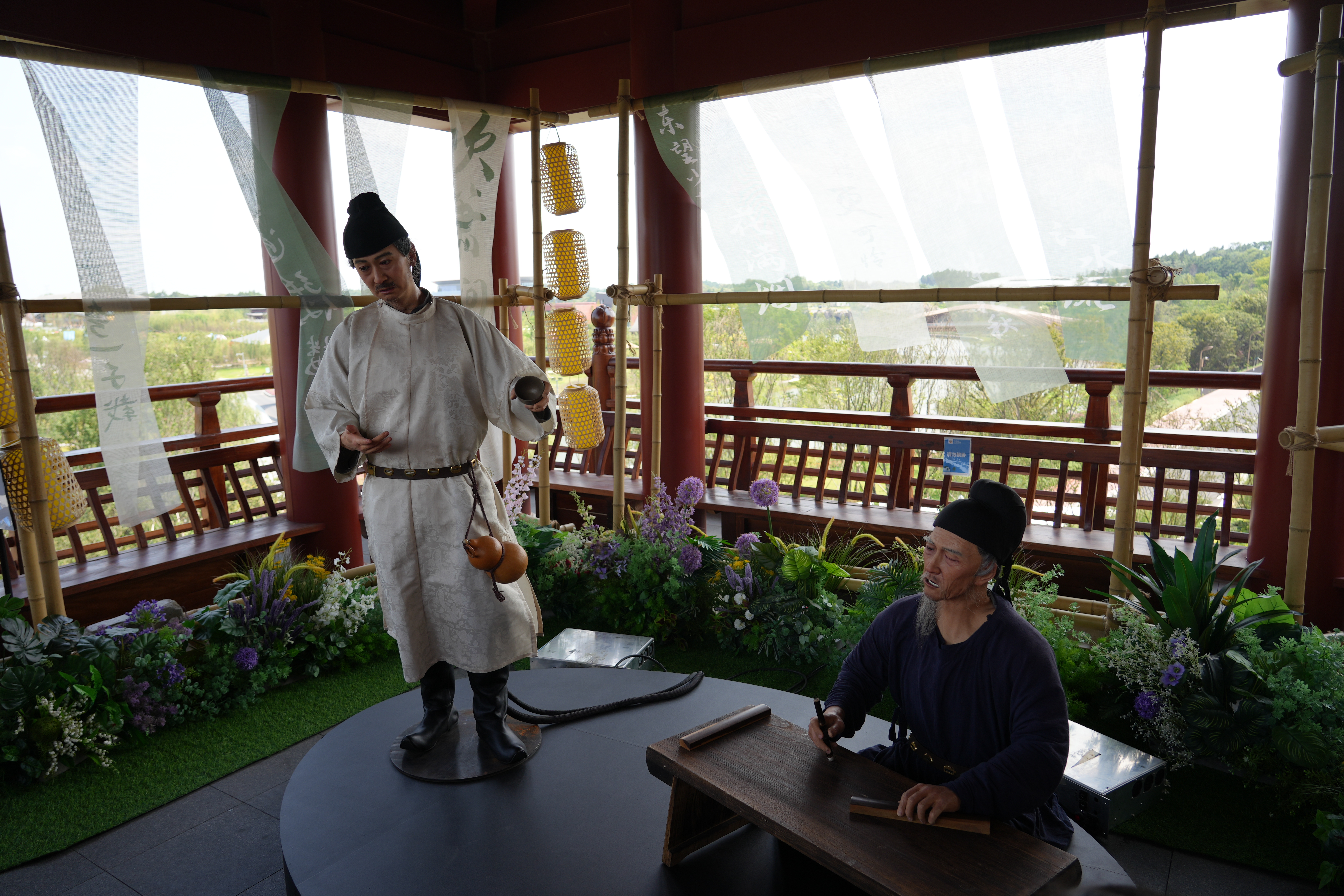 EX机器人,以李白、杜甫为原型梦回盛唐。成都世园会标志性建筑——锦云楼以李白《登锦城散花楼》为设计理念,融合中国传统楼阁特色,彰显出盛唐时期的成都风貌。楼中,EX机器人以李白、杜甫为原型,利用高端仿生科技,生动再现两位文豪的风采。“九天开出一成都,万户千门入画图”,一幅幅诗卷在两位诗人的吟唱中随风舞动,让游客梦回千年盛唐。