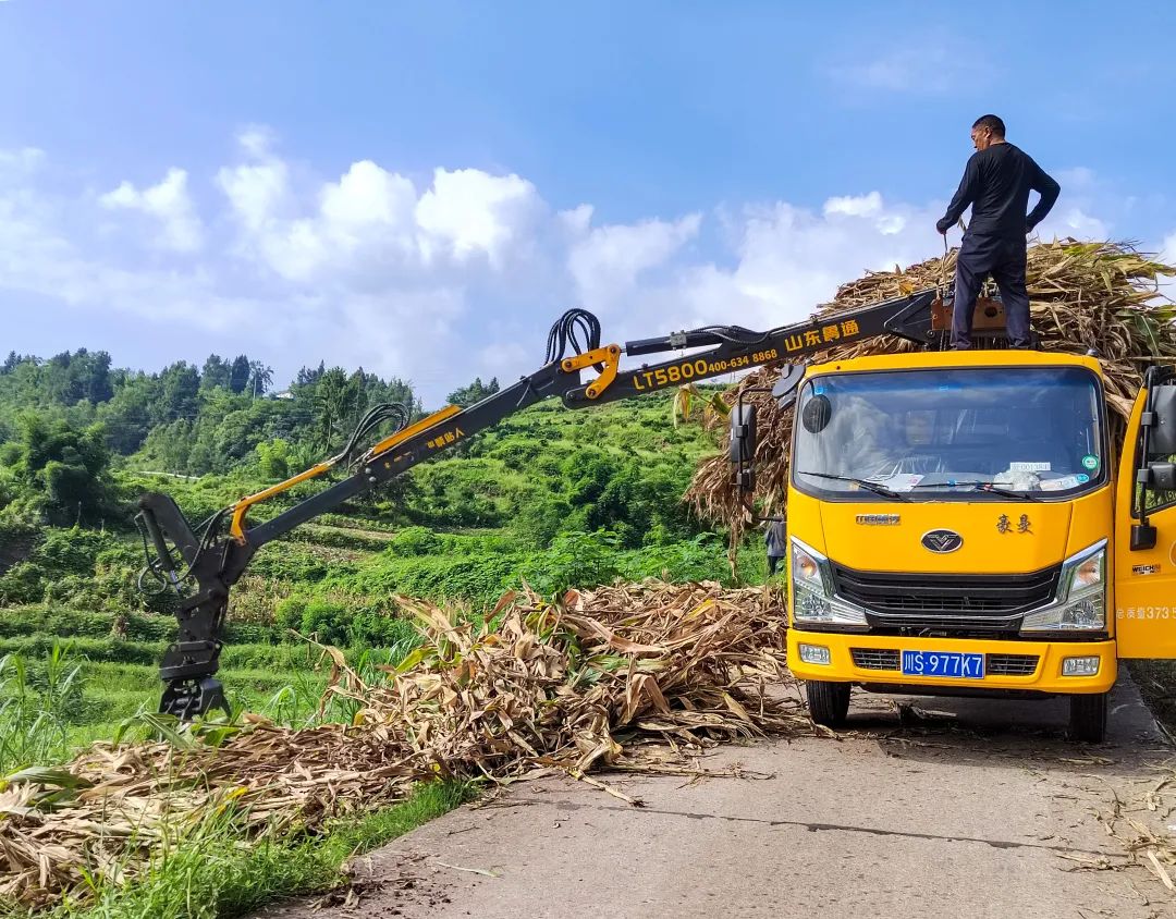 在塔河镇宝塔社区,玉米丰收的喜悦与秸秆再利用的商机交织在一起。村民们正将玉米秸秆一捆一捆地运往临时转运收储点,转运车挥舞着机械臂正进行装车,现场一片繁忙景象。