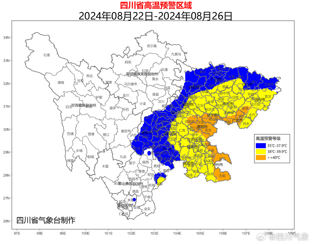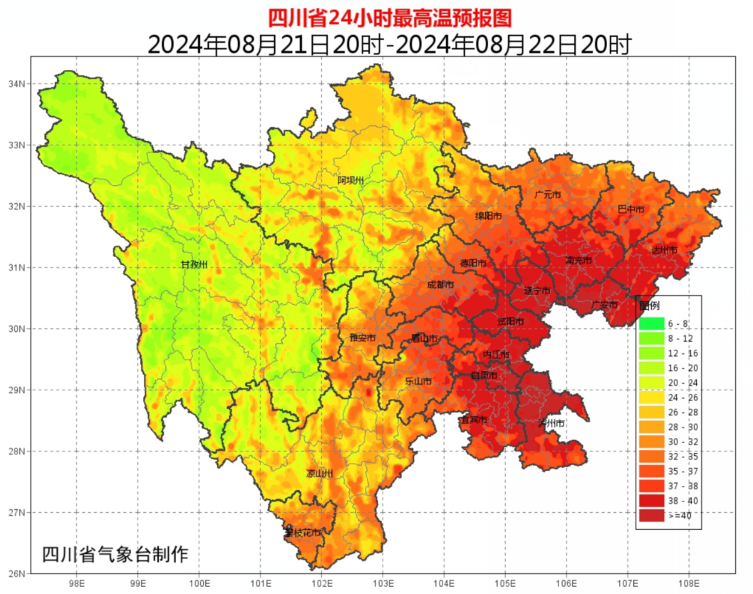 四川省气象台8月21日15时50分升级发布高温黄色预警:预计8月22日—26日,盆地大部日最高气温可达35~39℃,其中资阳、 泸州东部、自贡东部、内江东部、成都东部、遂宁南部、广安西部、达州南部的局部地方可达40℃或以上。