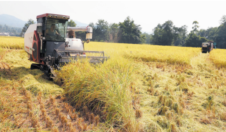 伴随着收割机马力全开的嗡鸣声,一块块稻田很快完成收割。为进一步提高收割效率,当地农业部门积极推广机械化作业方式,组织协调本地农业合作社机械和外省跨地区作业收割机开展社会化服务,对成熟水稻进行收割。这一举措使得收割一亩地的时间从以前的“3个人干一天”缩短至现在的一个小时左右,大大节省了人力和物力资源。