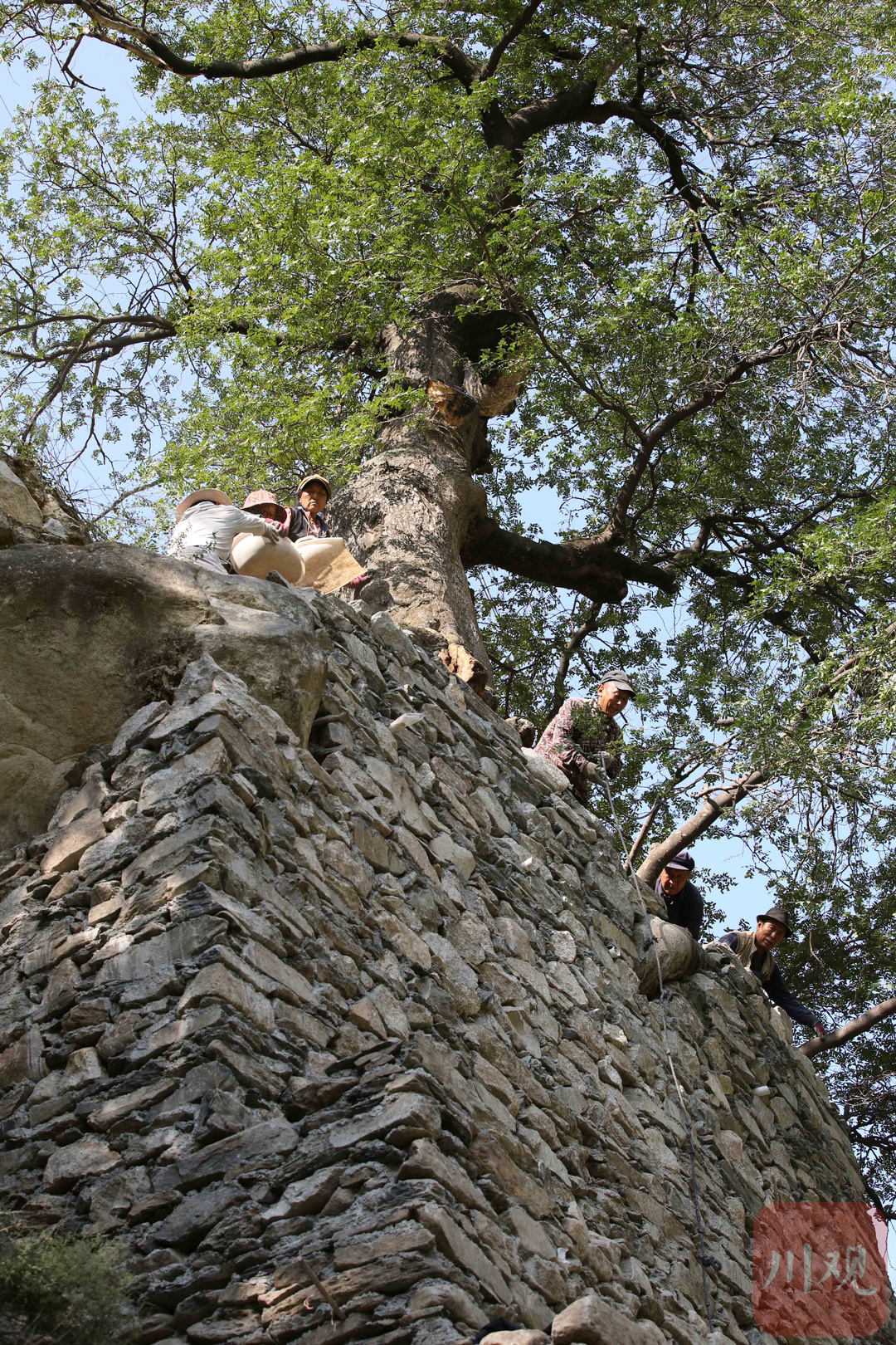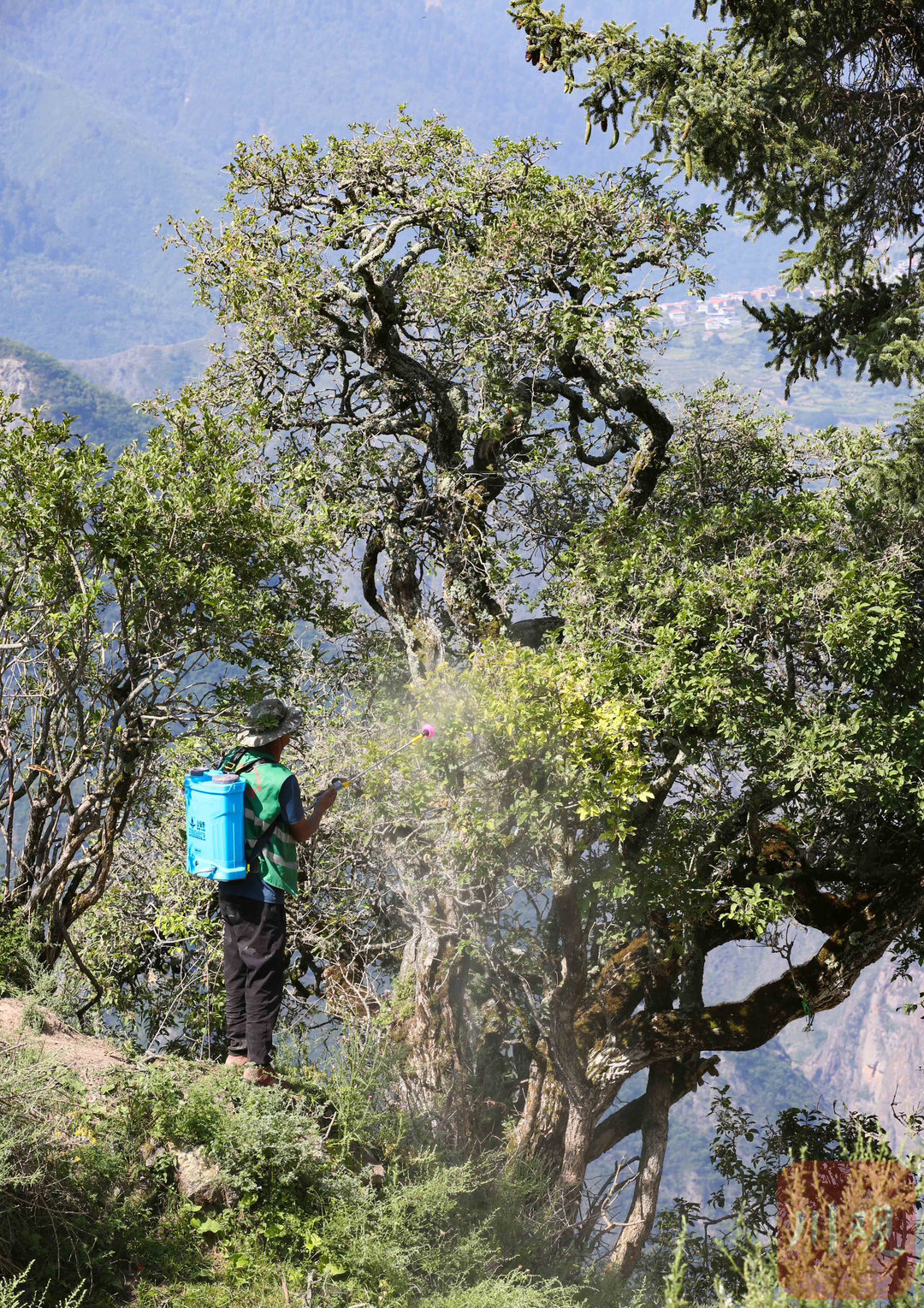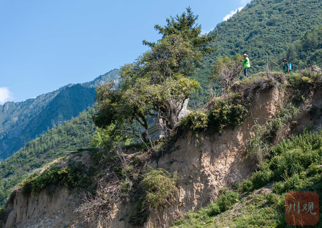 2024年8月27日,阿坝州黑水县木苏镇徐古村,黑水县林业和草原局林业工作人员采用修建挡坝的方式,保护一棵成长在绝壁上树龄超150余年的珍稀皂角树,通过新建的边坡石坝重新填充泥土,使皂角树根部得到巩固。在海拔2800多米的龙坝乡西苏村,县林业和草原局林业工作人员正对一棵树龄超过100年遭受严重病虫害栓翅卫矛树喷洒杀虫剂、修剪枯枝。2024年6月,这棵栓翅卫矛树在调查中发现遭受严重病虫害,需要通过喷洒杀虫剂治疗。
