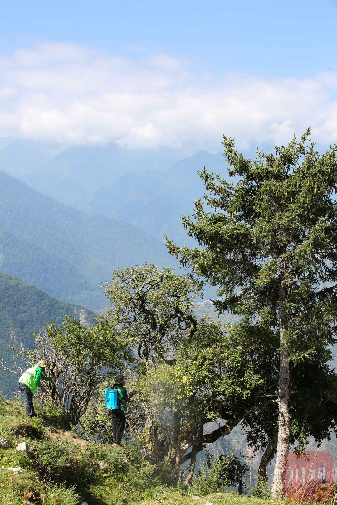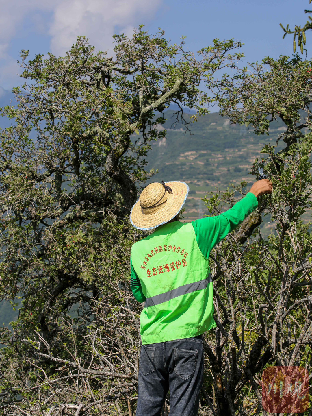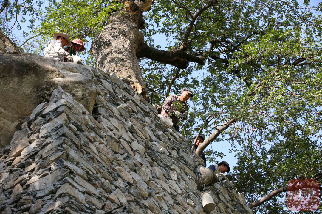 2024年8月27日,阿坝州黑水县木苏镇徐古村,黑水县林业和草原局林业工作人员采用修建挡坝的方式,保护一棵成长在绝壁上树龄超150余年的珍稀皂角树,通过新建的边坡石坝重新填充泥土,使皂角树根部得到巩固。在海拔2800多米的龙坝乡西苏村,县林业和草原局林业工作人员正对一棵树龄超过100年遭受严重病虫害栓翅卫矛树喷洒杀虫剂、修剪枯枝。2024年6月,这棵栓翅卫矛树在调查中发现遭受严重病虫害,需要通过喷洒杀虫剂治疗。