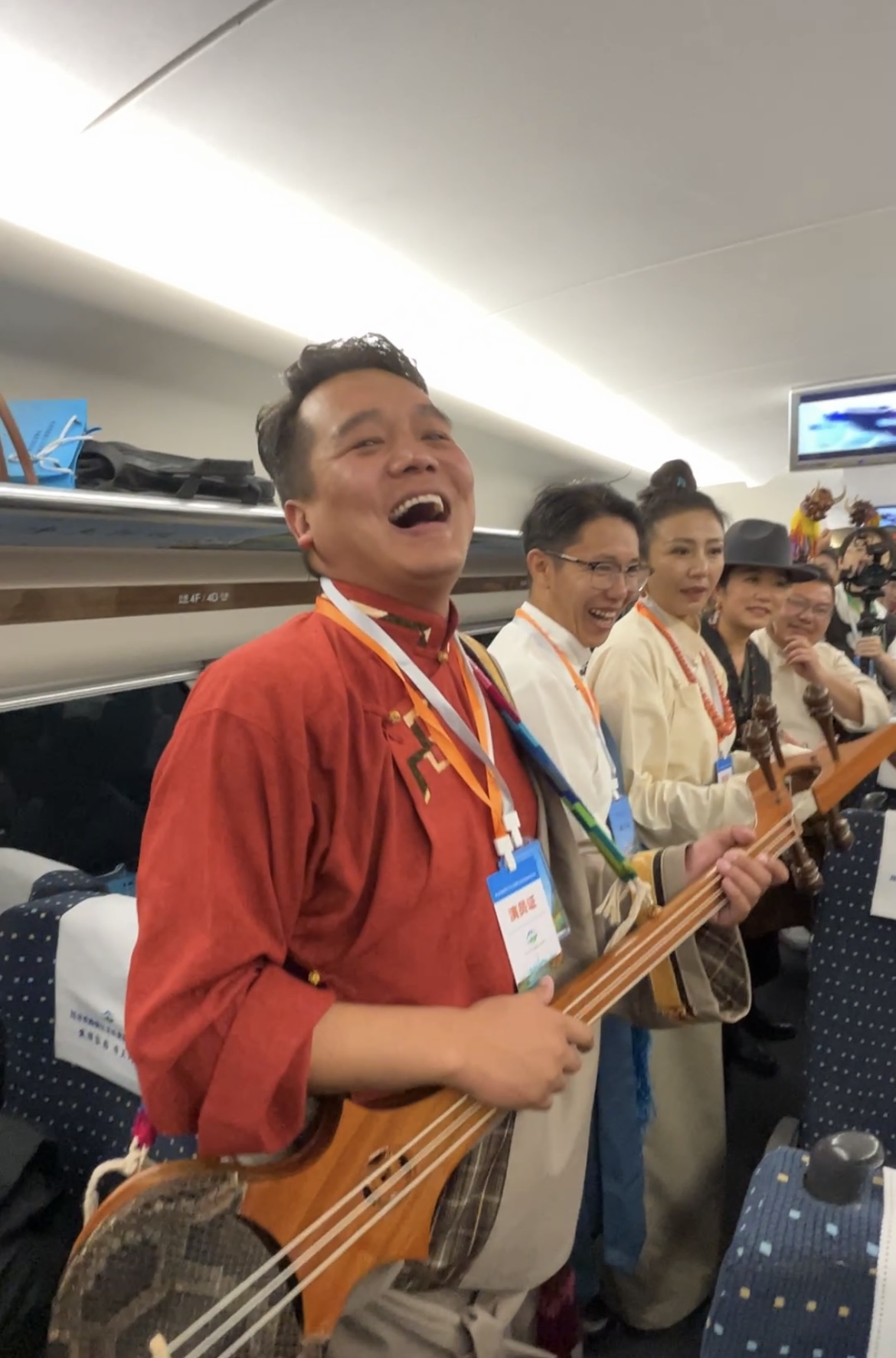 首发动车上仪式感满满,来自阿坝州民族歌舞团的演出人员,身着藏、羌、回等多民族服饰,手持牛角琴、龙头琴为旅客们带来精彩的歌舞表演。