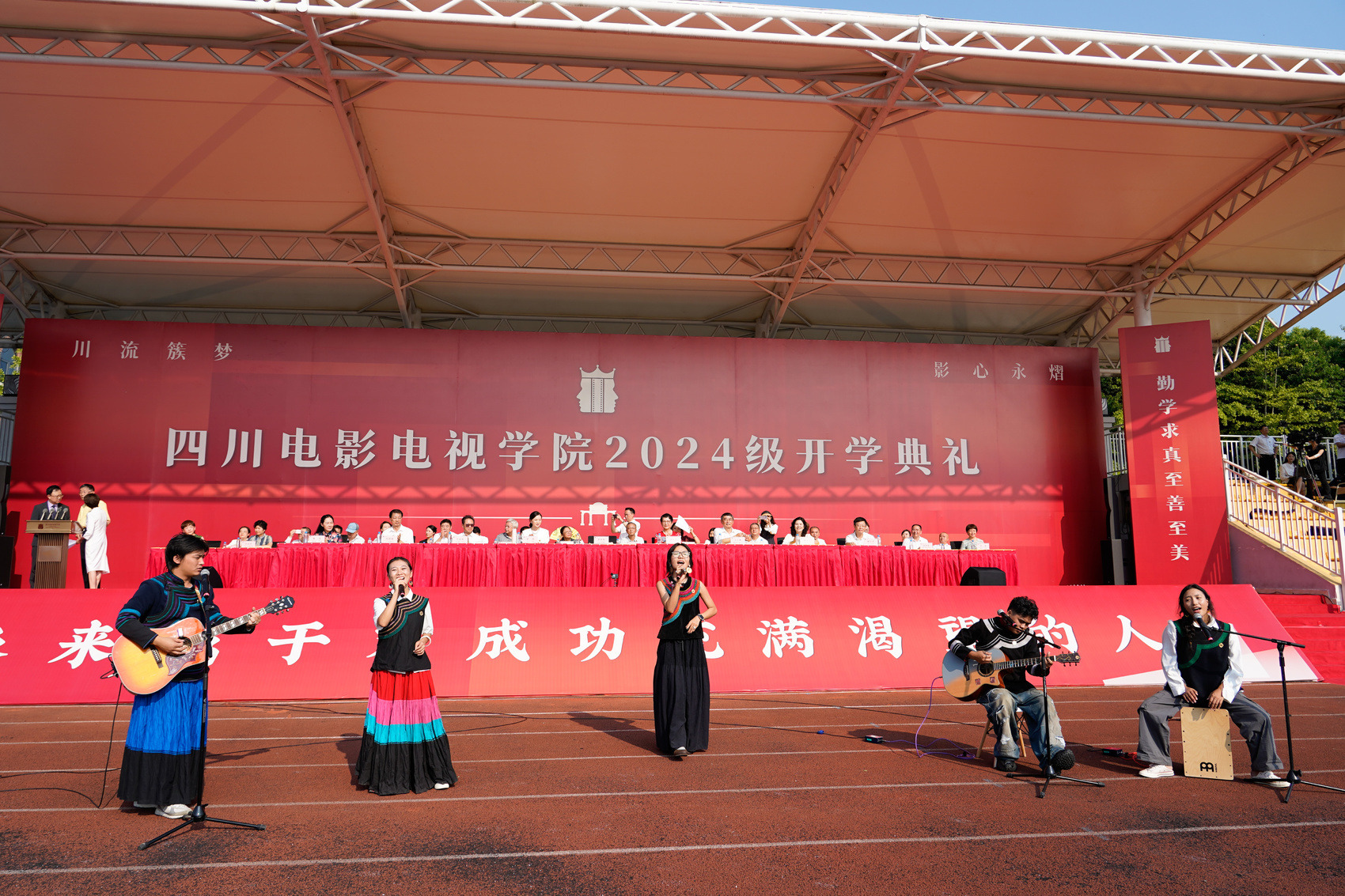 9月1日,四川电影电视学院2024级新生开学典礼现场,“拾光者计划”乐队成员作为新生代表闪亮登场,现场演唱了歌曲《奔赴未来》。