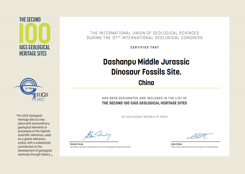 “大山铺中侏罗世恐龙遗址”项目入选证书