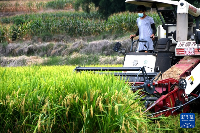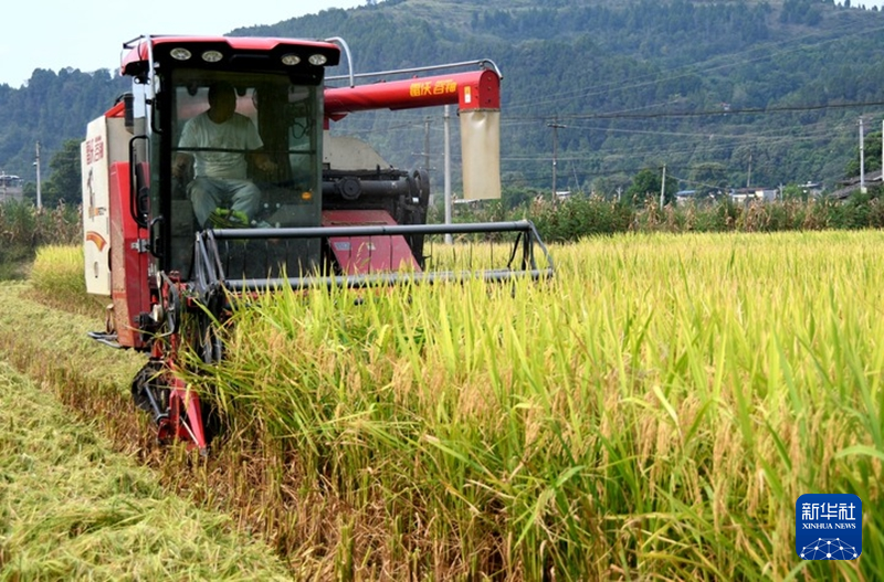 8月29日,在三台县北坝镇芙蓉村,一台收割机正在收割稻谷。新华社记者高健钧 摄