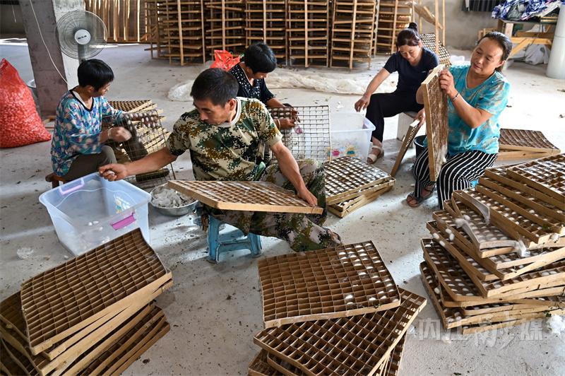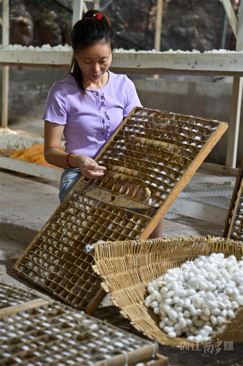 9月5日,内江市东兴区顺河镇冷家村,东兴区吕林江蚕桑养殖家庭农场,蚕农正在采摘蚕茧