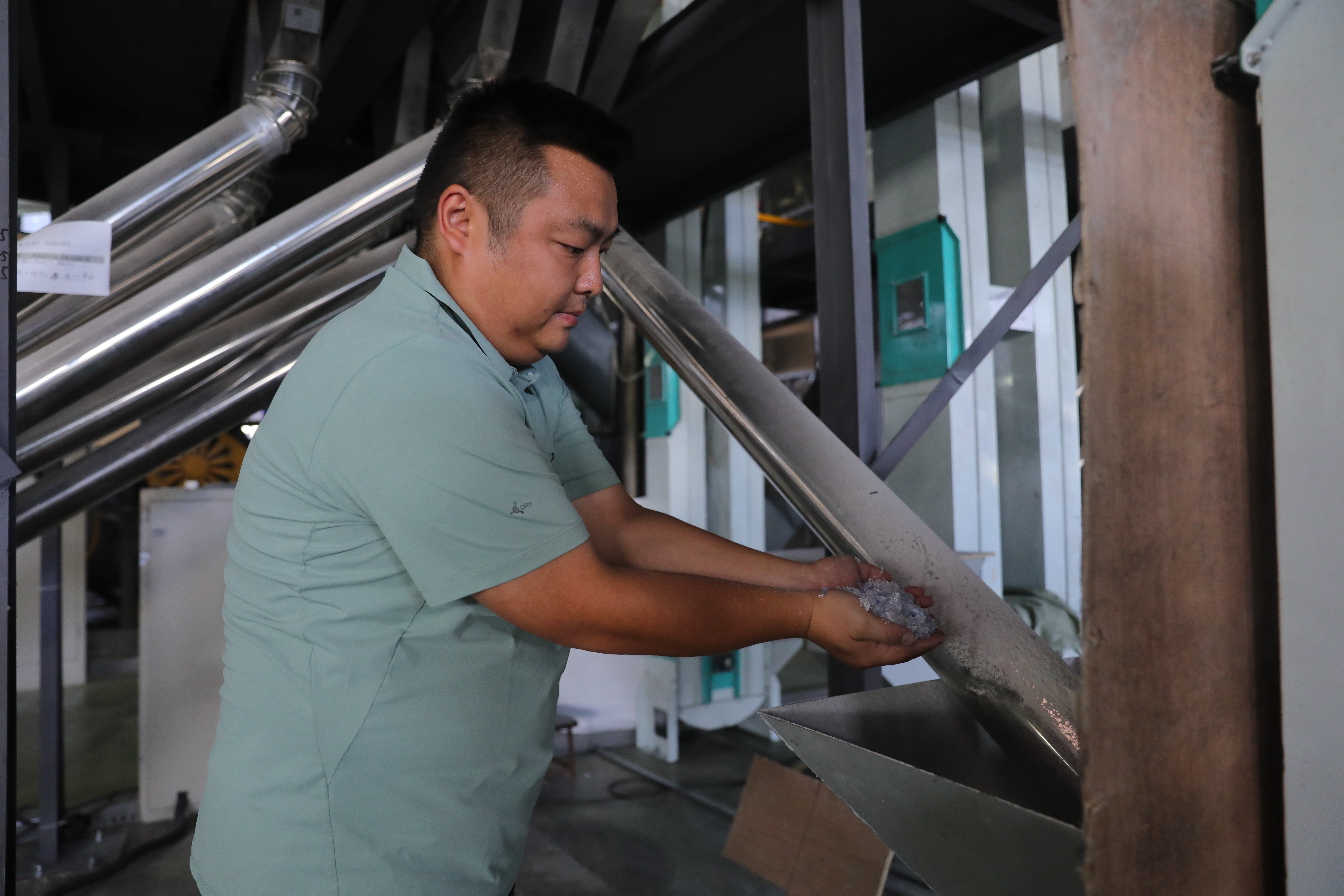 跟随生产流水线向前走,记者在现场看到,破碎清洗回收线、整瓶材色分选设备等机器发出巨大轰鸣,而在生产线上基本看不到工人的身影。塑料瓶经历选杂、分色、清洗、破碎除杂、高温蒸煮、漂洗等12道工序,最终被“吃干榨尽”,变成一颗颗不过指甲盖大小的PET瓶片。