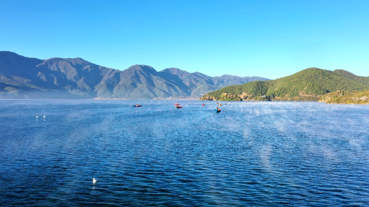 秋天,每一个在泸沽湖醒来的清晨都充满诗意。湖面上总是笼罩着轻轻的薄雾,阳光穿过薄雾洒向湖面,湖水便泛起粼粼的微光。在湖面上无数间歇闪耀的光影里,只有湖水的蓝从始至终,贯穿四季与昼夜。行走在湖边,清凉的风从四面八方涌来,微微摇摆的衣角与湛湛晴空都在无声复述无尽的宁静和美丽。