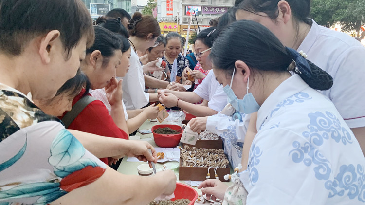 活动现场设立了中医义诊、中医适宜技术体验区、中药养生茶饮品尝区等7个摊位。记者在现场看到,医护人员变身“夜市摊主”,前来咨询、体验的市民络绎不绝。