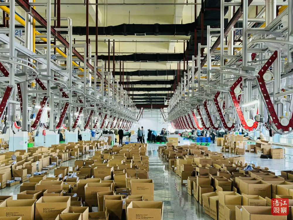 在大多数人印象中,服装纺织行业属于传统工业中的劳动密集型产业。然而,记者在现场看到,第四车间已经引入了一条自动智能吊挂生产线,上一个环节的工人只需把半成品挂到吊挂机上,就自动运输到下一个工序进行下一步的生产。