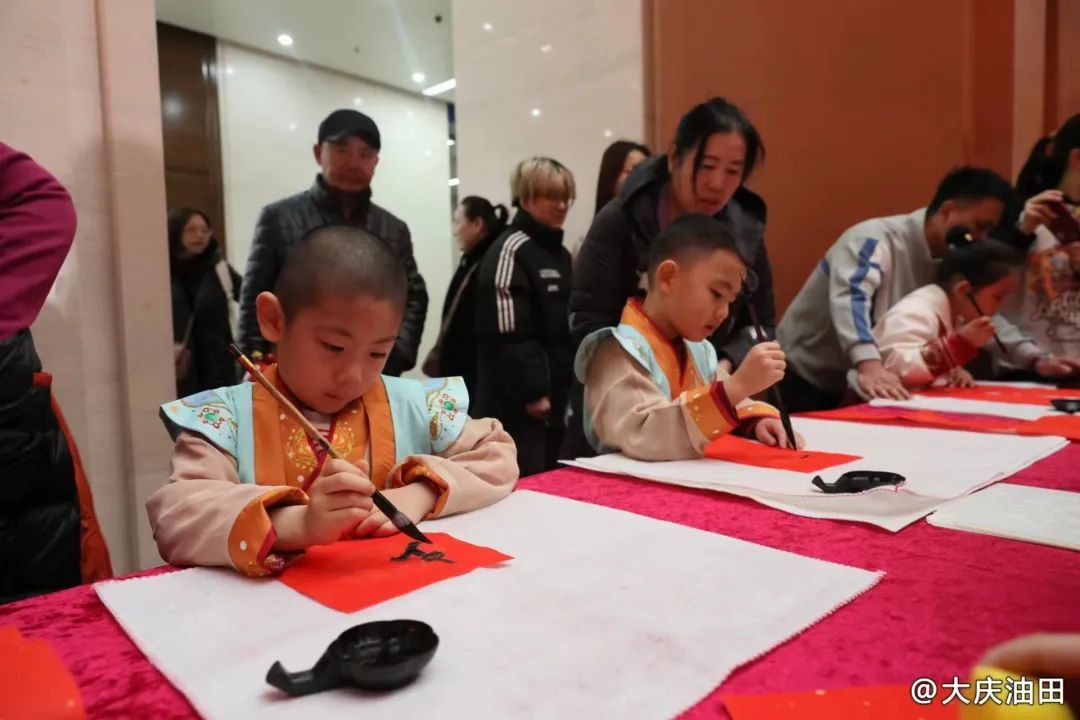 活动中,书法、拓印非遗文化体验备受欢迎,大小朋友踊跃参与,或是提笔蘸墨,书写“福”字与祝福对联;或是手持滚刷精心拓印,创作出一幅幅精美年画。