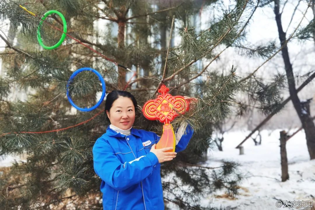 中油电能热电二公司燃料部输煤运行专业电运班组值班员左丽国在单位路两侧的松树上挂上福字彩灯,即将退休的她,要把祝福送给所有石油人,祝愿大家蛇年行大运,更上一层楼。