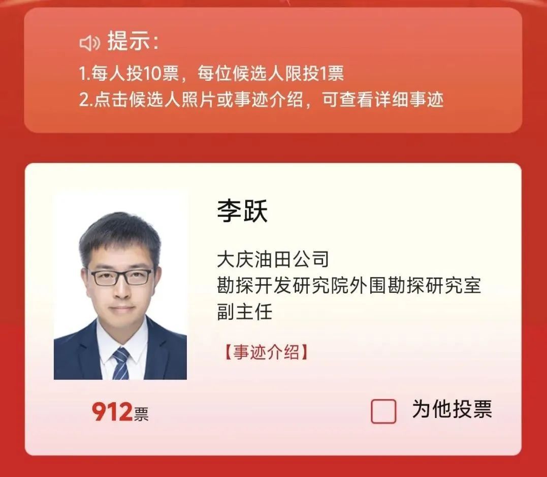李跃,男,汉族,34岁,中共党员,博士研究生,大庆油田有限责任公司勘探开发研究院外围勘探研究室副主任。