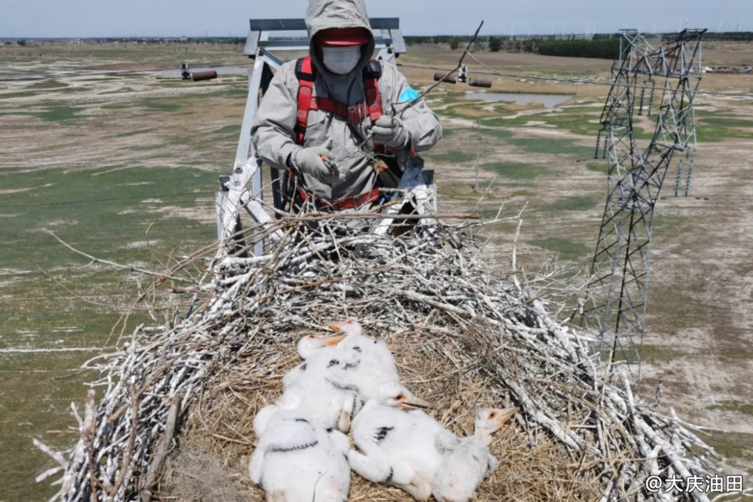 中油电能供电公司特种运维部带电作业队在使用无人机勘查时,发现一个鸟窝搭在110千伏春庆乙线杆塔上,里面有6只刚孵化的幼鸟,高空有一只大鸟盘旋,嘴长羽白,经确认,原来是国际濒危物种——国家一级保护动物东方白鹳。带电作业队一边联系野生动物协会,一边将鸟窝修枝加固,并制作绝缘隔板挡住幼鸟,以防它们掉落。他们凭借精湛的“手艺”,既让珍稀鸟类顺利安家,又保障了春庆乙线的平稳运行。