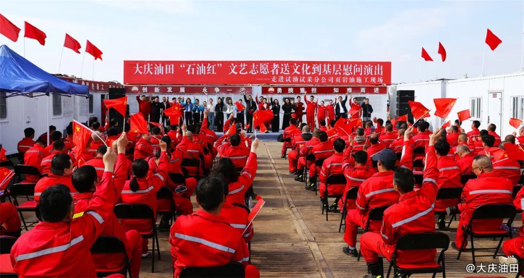 “我当个石油工人多荣耀!”4月28日,试油试采分公司页岩油施工现场响起嘹亮的合唱声。“五一”国际劳动节前夕,50余名“石油红”文艺志愿者顶着春风,将舞台搭进轰鸣的作业区。书法家挥毫泼墨写下“陆相页岩开新宇 百年油田续辉煌”,歌伴舞《想要跳舞吗》引得员工们打着节拍加入,一本本《石油文学》杂志带着油墨香递到沾满油渍的手中……这场油田文联组织的慰问演出,让150余名一线干部员工提前收到了节日的温暖“大礼包”。