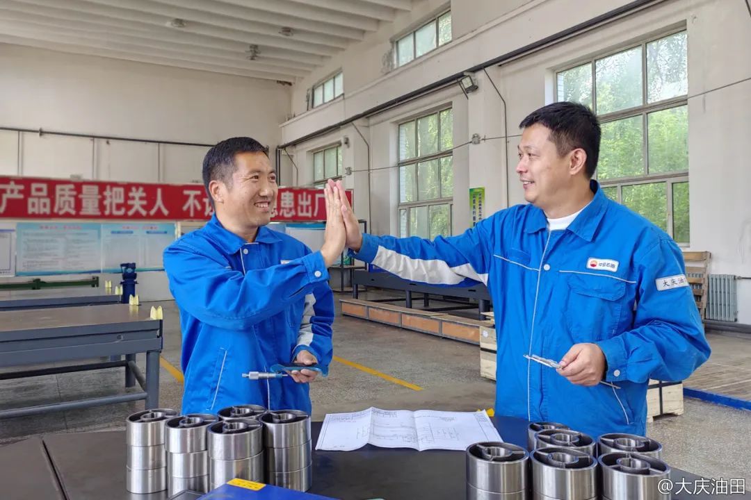 近日,装备制造集团力神泵业有限公司监测中心配件检验站来了256件接头补芯,这批配件来得急要得也急,公司要求两天之内完成全部配件的检验。班长黄常虎(左一)接到任务后马上行动,带领检验员王岩分工合作,默契配合,互相打气,经过一天多的奋战,终于在规定时间内完成了全部配件的检验任务。看着面前的合格品,他俩激动地相互击掌,笑着说:“只要心往一处想,劲往一处使,就没有办不成的事。”