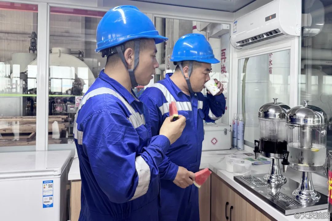 随着油田一秒入夏,采油四厂第八作业区注采804班拿出了早已备好的“解暑良方”。在员工餐桌上,除了营养健康的餐食,还多了一碗精心熬制的绿豆汤,以及夏季解暑蜜瓜。此外,这个班组还会提前将空调温度调至人体最舒适的26℃,保证每一名员工既清凉又健康。