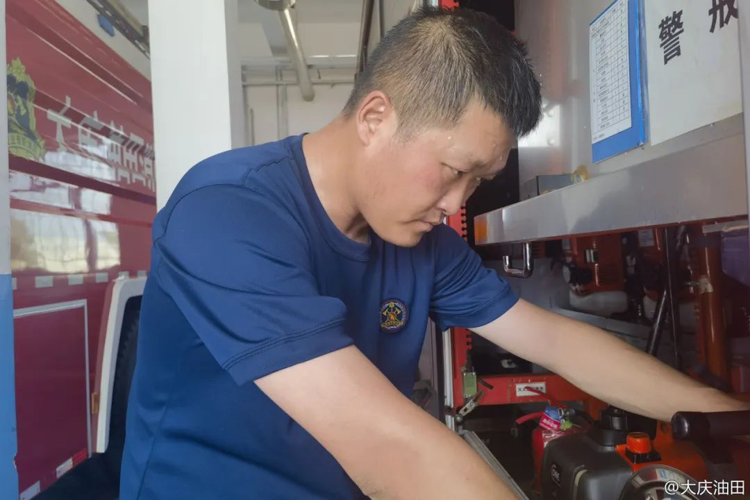 35℃的酷暑里,即便汗珠顺着大庆油田消防支队银浪消防大队分队长李韦的额角砸在地面上,他手上的活计仍然不停。反复擦拭水带接口的每道缝隙、拧紧螺丝……从车头灯到出水口,每件经他手的装备都泛着锃亮的光。他说:“照顾好‘老伙计’,它们才不会在火场上掉链子,人民生命财产安全才会多一分保障。”