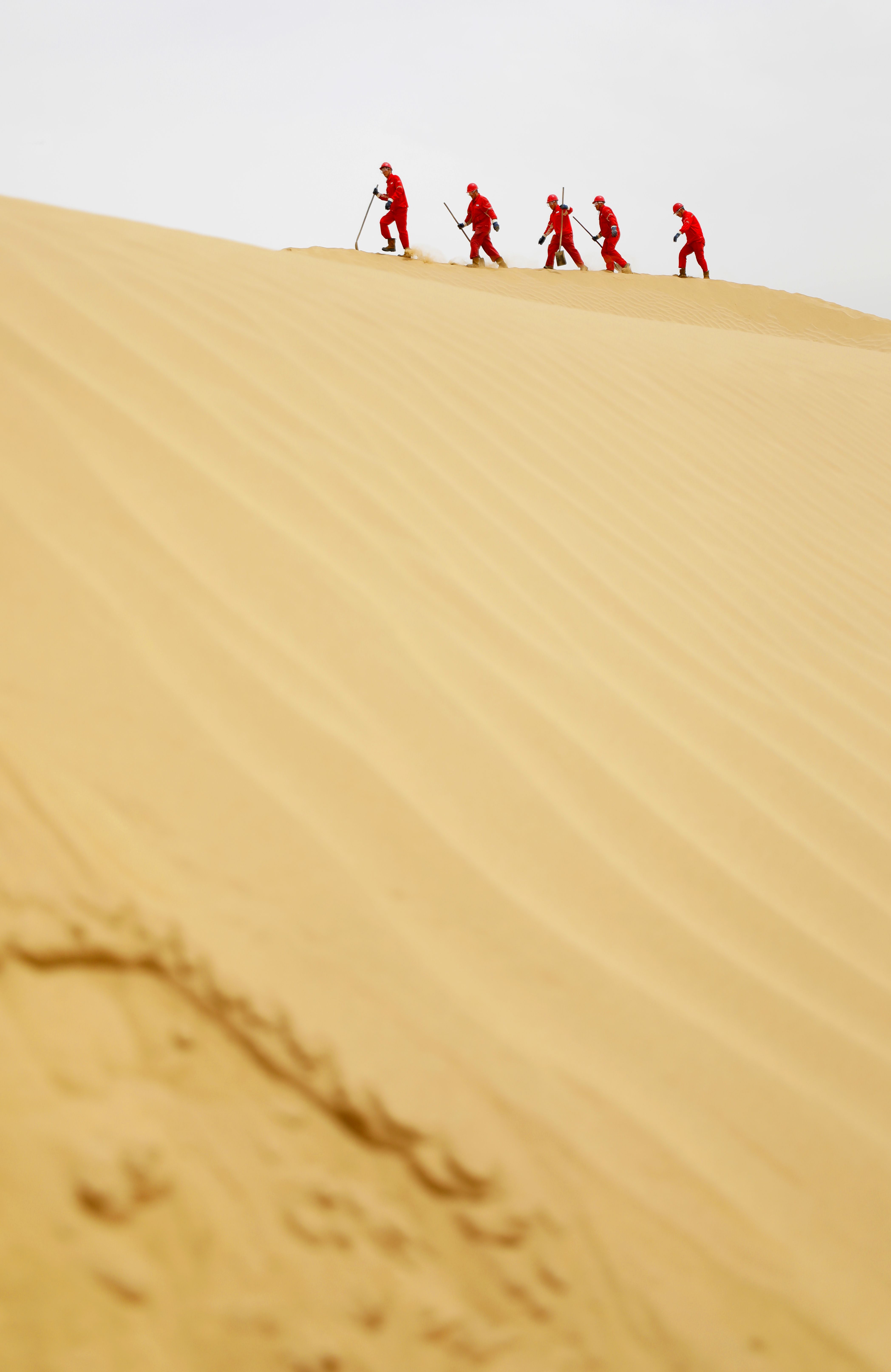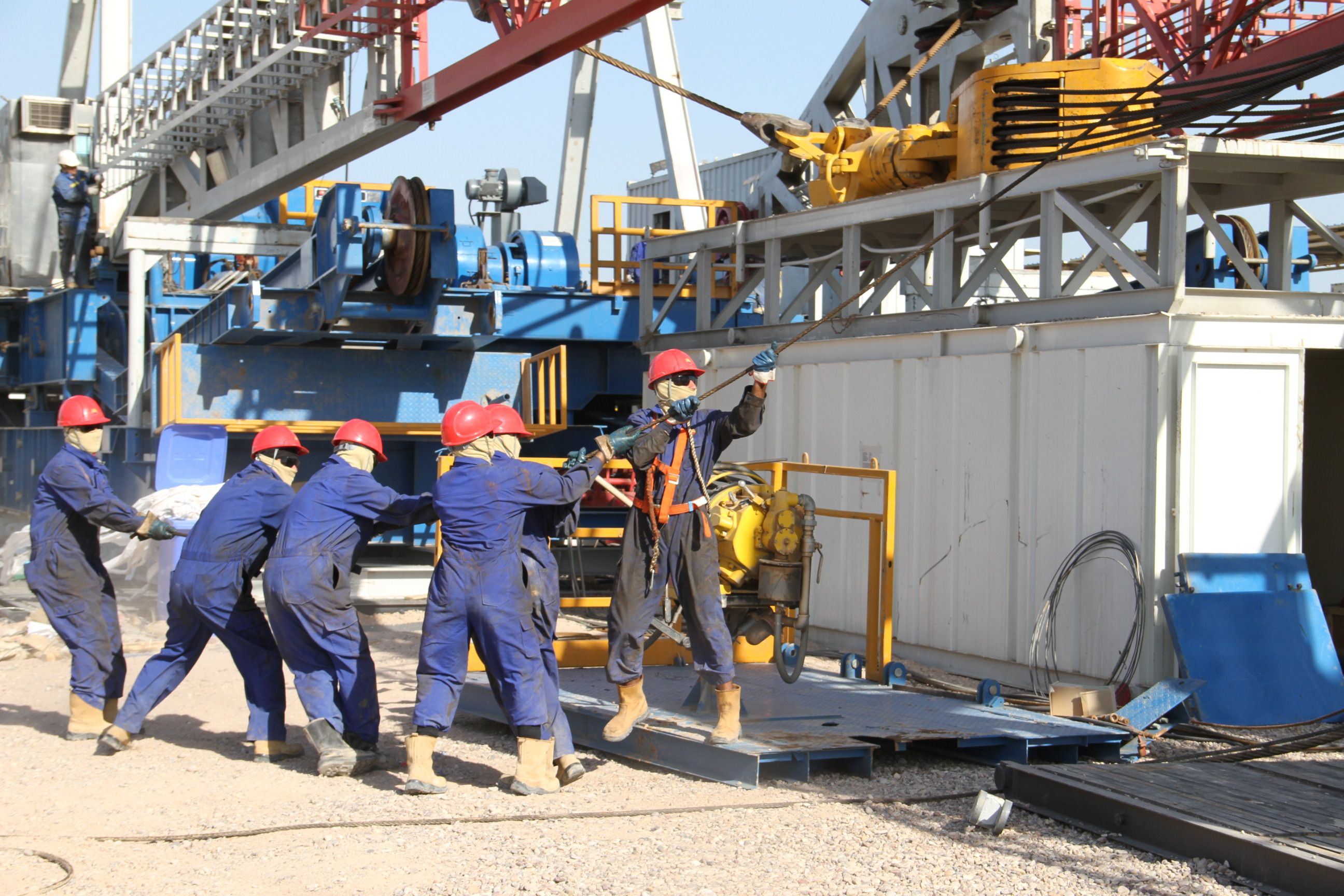 在伊拉克哈法亚油田,DQ1205钻井队员正在穿大绳。