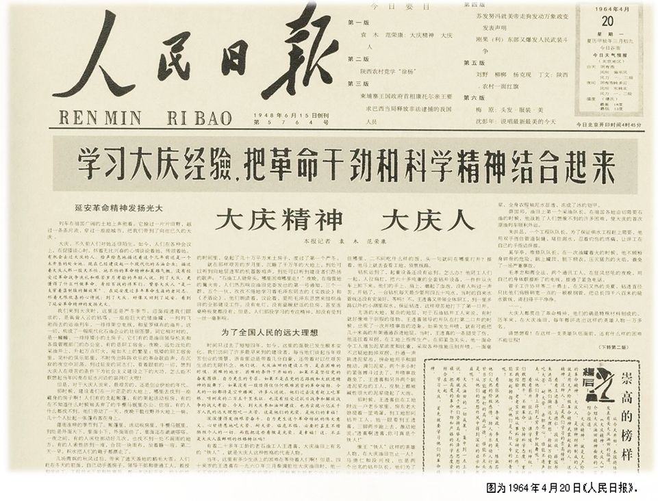 1964年4月19日晚,中央人民广播电台在“新闻联播”时间,由著名播音员齐越,像播“九评”一样,用庄严、高昂、激越的声音,向全世界播发了这篇通讯《大庆精神大庆人》。当晚,大庆组织了收听,播完就有人敲锣打鼓上街庆贺!第二天,4月20日,《人民日报》《工人日报》等全国各大报纸都在头版头条刊登了这篇通讯。人们听了看了无不欢欣鼓舞,互相转告中国有了大油田,表示要向大庆人学习,发扬大庆精神!