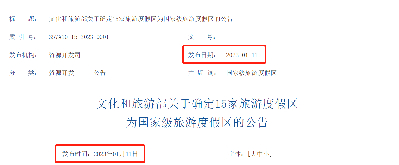 根据中华人民共和国国家标准《旅游度假区等级划分》与《国家级旅游度假区管理办法》,经有关省(区、市)文化和旅游行政部门推荐,文化和旅游部按程序组织认定并完成公示,确定以下15家旅游度假区为新一批国家级旅游度假区。