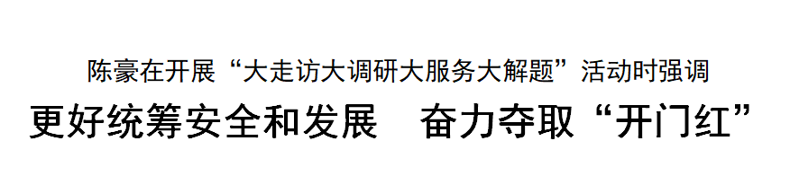 陈豪强调,各级各部门要深入贯彻落实省委关于开展“大走访大调研大服务大解题”活动的部署要求,以营商环境“一号改革工程”为牵引,深入基层一线,主动靠前服务,送政策、解难题,及时回应、切实解决每一家企业、每一个项目、每一位人才的需求和诉求。要加强安全生产服务指导,以“时时放心不下”的责任感抓好安全生产工作,压紧压实行业监管责任、企业主体责任,为“抢开局、稳增长、抓落实”提供更加安全稳定的社会环境。