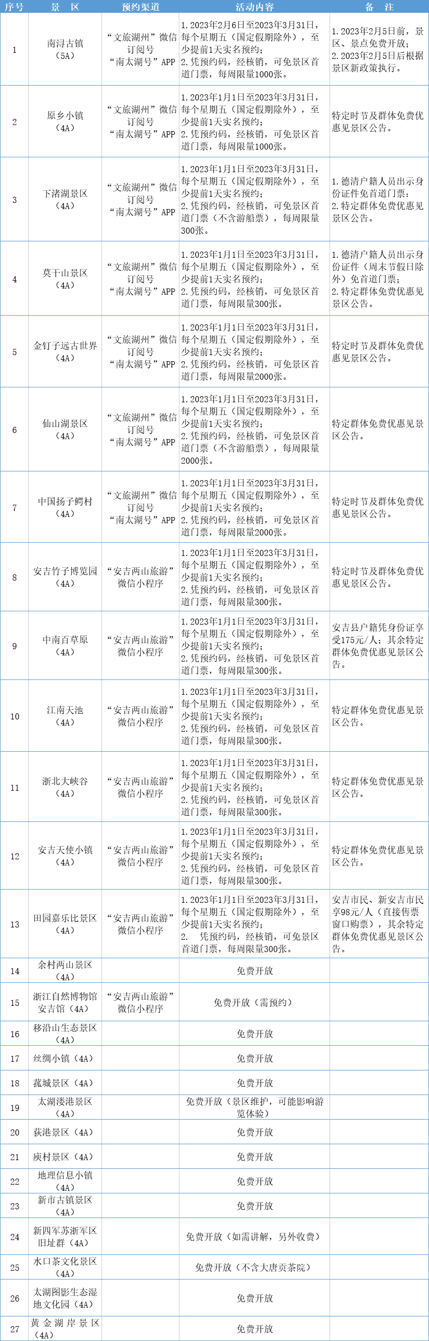 湖州市文化广电旅游局,于2023年1月1日—3月31日开展“相约星期五、免费游湖州”文旅惠民活动。每周五全市27家4A级及以上景区向游客免费开放。