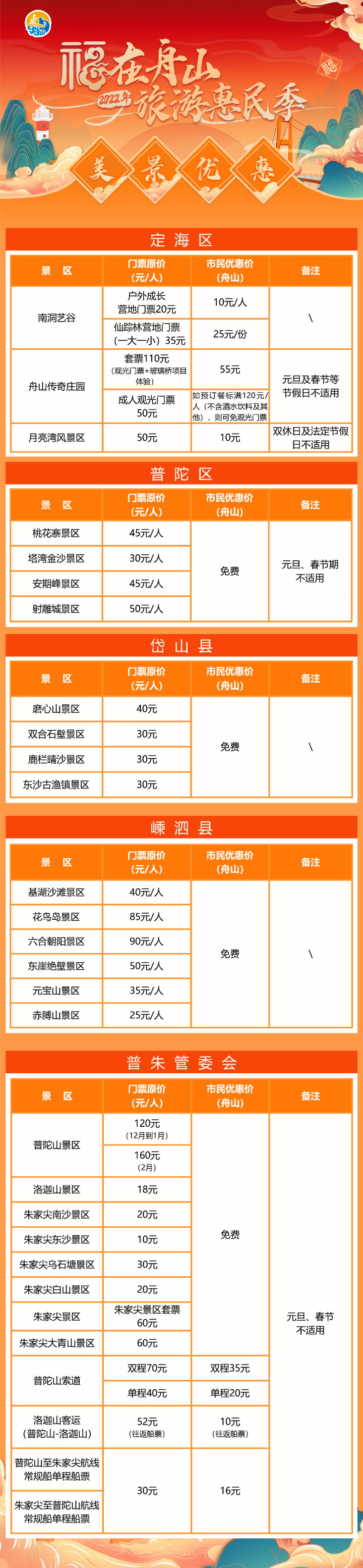 2022年12月1日到2023年2月28日,舟山市市民凭身份证或电子社保卡可享受普陀山等全市22个景点0元游优惠政策(新舟山人出示电子社保卡)。