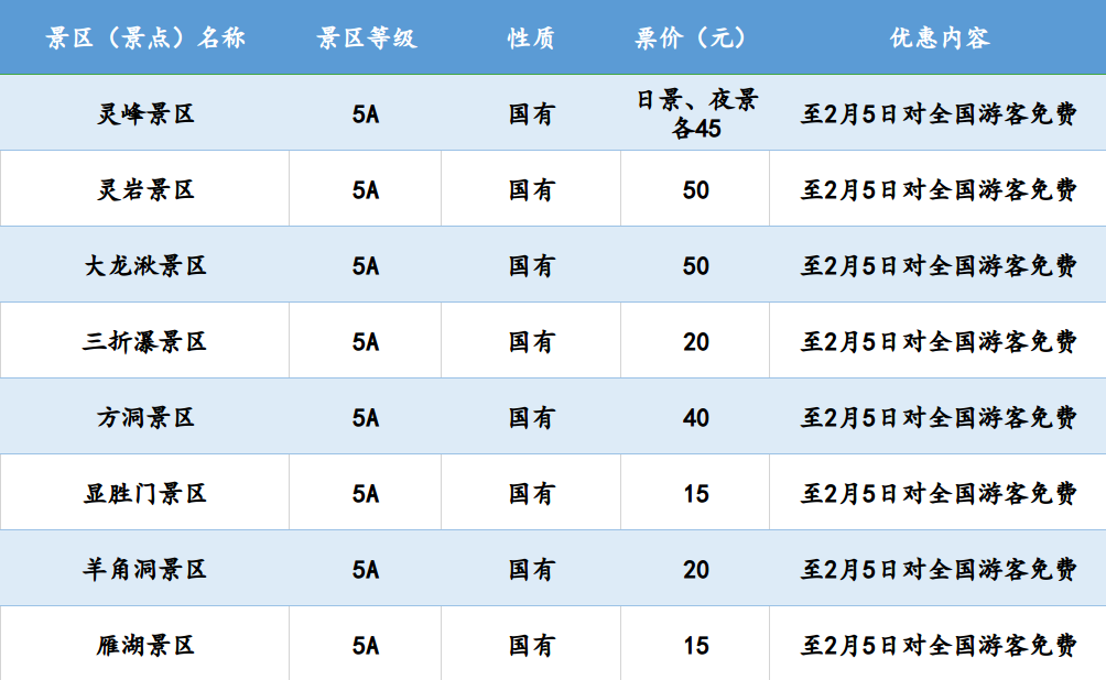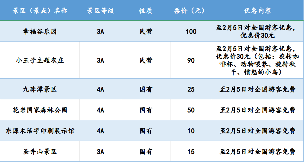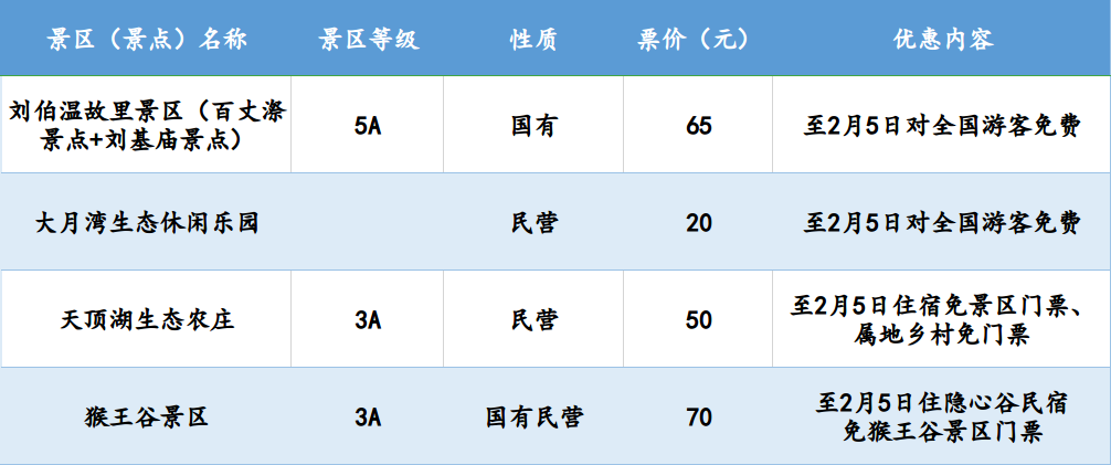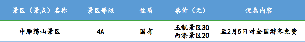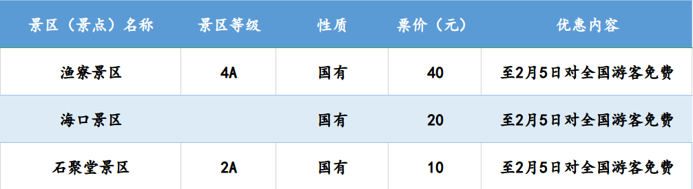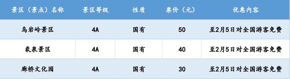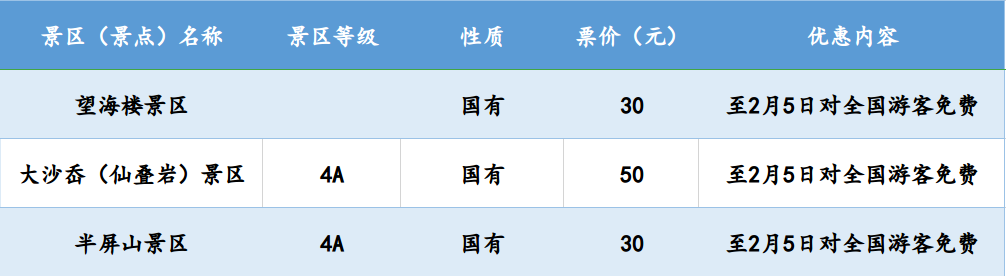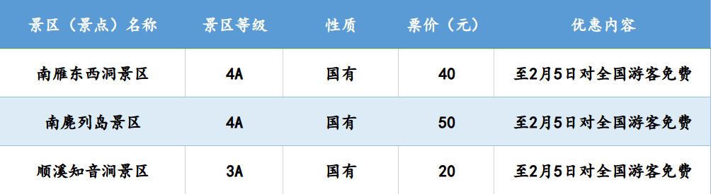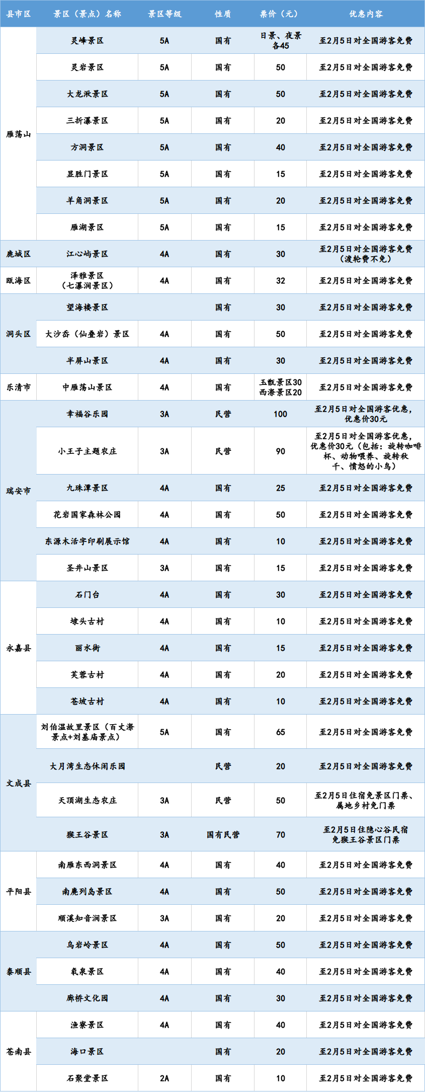 温州全市42家国有景区(含雁荡山景区)、13家民营景区一季度免费对全国医护人员开放;即日起到2月5日(元宵节),42家国有景区免费对全国游客开放,其中部分景区的免费政策延续到3月底。