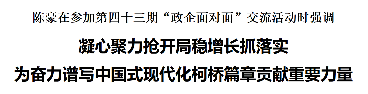 1月12日下午,第四十三期“政企面对面”贸易经济提升专场交流活动在区行政中心举行。柯桥区委书记陈豪强调,要深入学习党的二十大精神,全面贯彻落实省、市关于经济工作的最新部署以及区委全会、区“两会”部署要求,锚定“全省竞跑、示范先行”目标任务,提振信心、鼓足干劲,抢抓机遇、奋勇前行,凝心聚力抢开局、稳增长、抓落实,为奋力谱写中国式现代化柯桥篇章贡献重要力量。