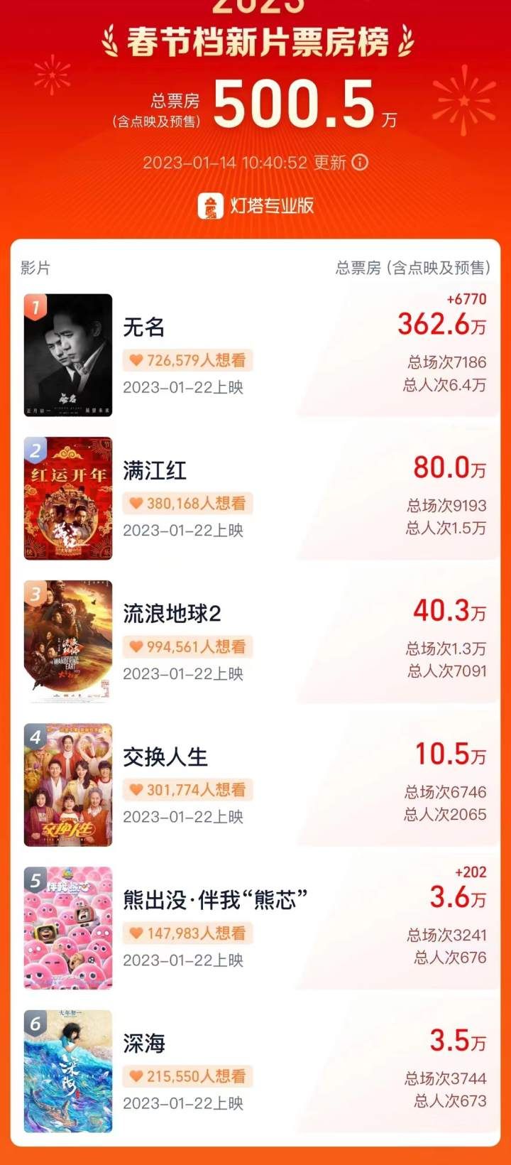 据灯塔专业版实时数据,1月14日10时40分,2023年春节档6部新片(《中国乒乓之绝地反击》暂未开启)预售总票房破500万元。其中《无名》《满江红》《流浪地球2》分别以362.6万元、80万元、40.3万元分列预售票房榜前三位。