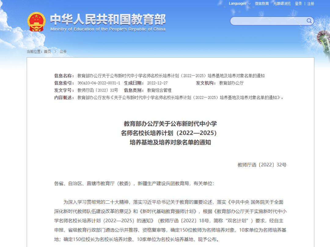 新时代中小学名师名校长培养计划