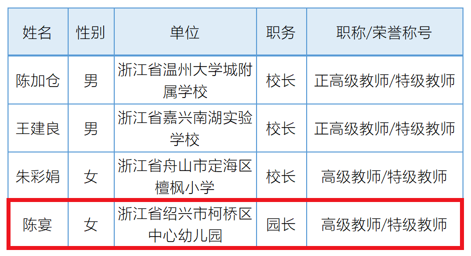 近日,教育部公布了《新时代中小学名师名校长培养计划(2022—2025)培养基地及培养对象名单》。其中,浙江省确定绍兴市柯桥区中心幼儿园园长陈宴等4位校长为名校长培养对象、1家单位为名校培养基地;4位教师为名师培养对象。