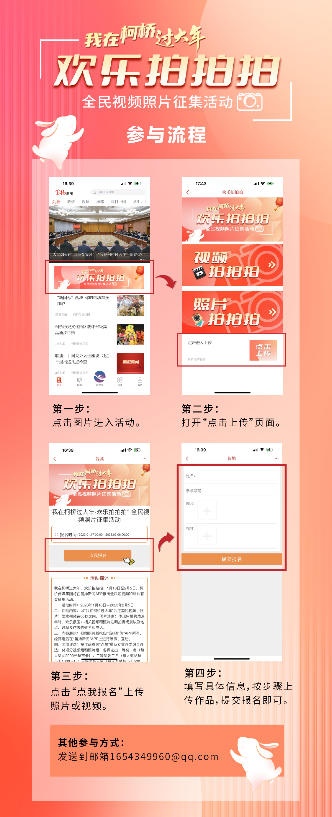 二、活动内容:以“我在柯桥过大年”为主题的视频、照片;要求视频在60秒之内,照片清晰;体现柯桥的浓浓年味、欢乐氛围;相关视频和照片注明拍摄场景以及地点、时间及作者的姓名和电话。