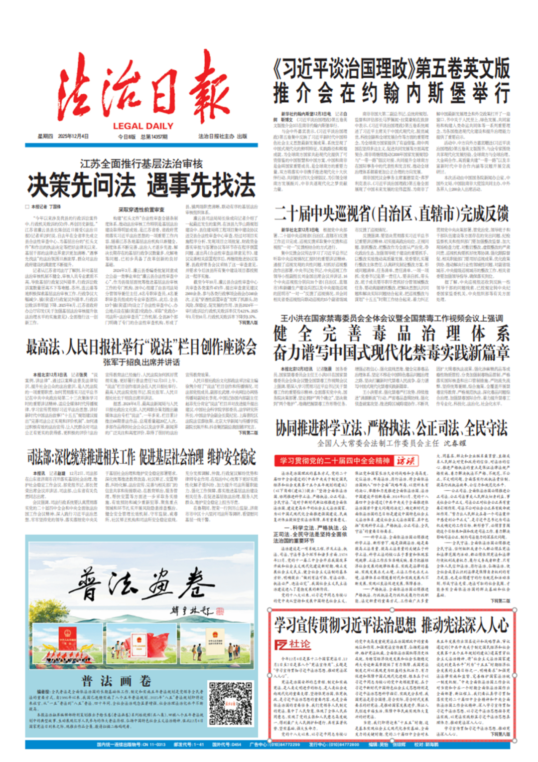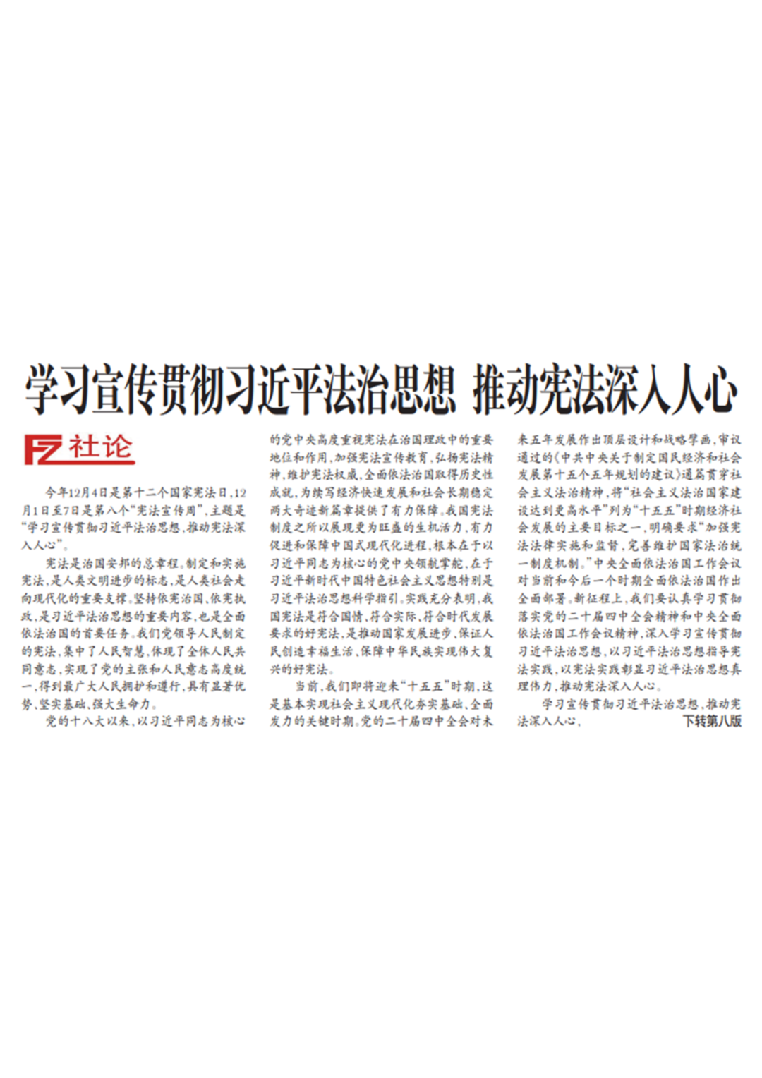 今年12月4日是第十二个国家宪法日,12月1日至7日是第八个“宪法宣传周”,主题是“学习宣传贯彻习近平法治思想,推动宪法深入人心”。