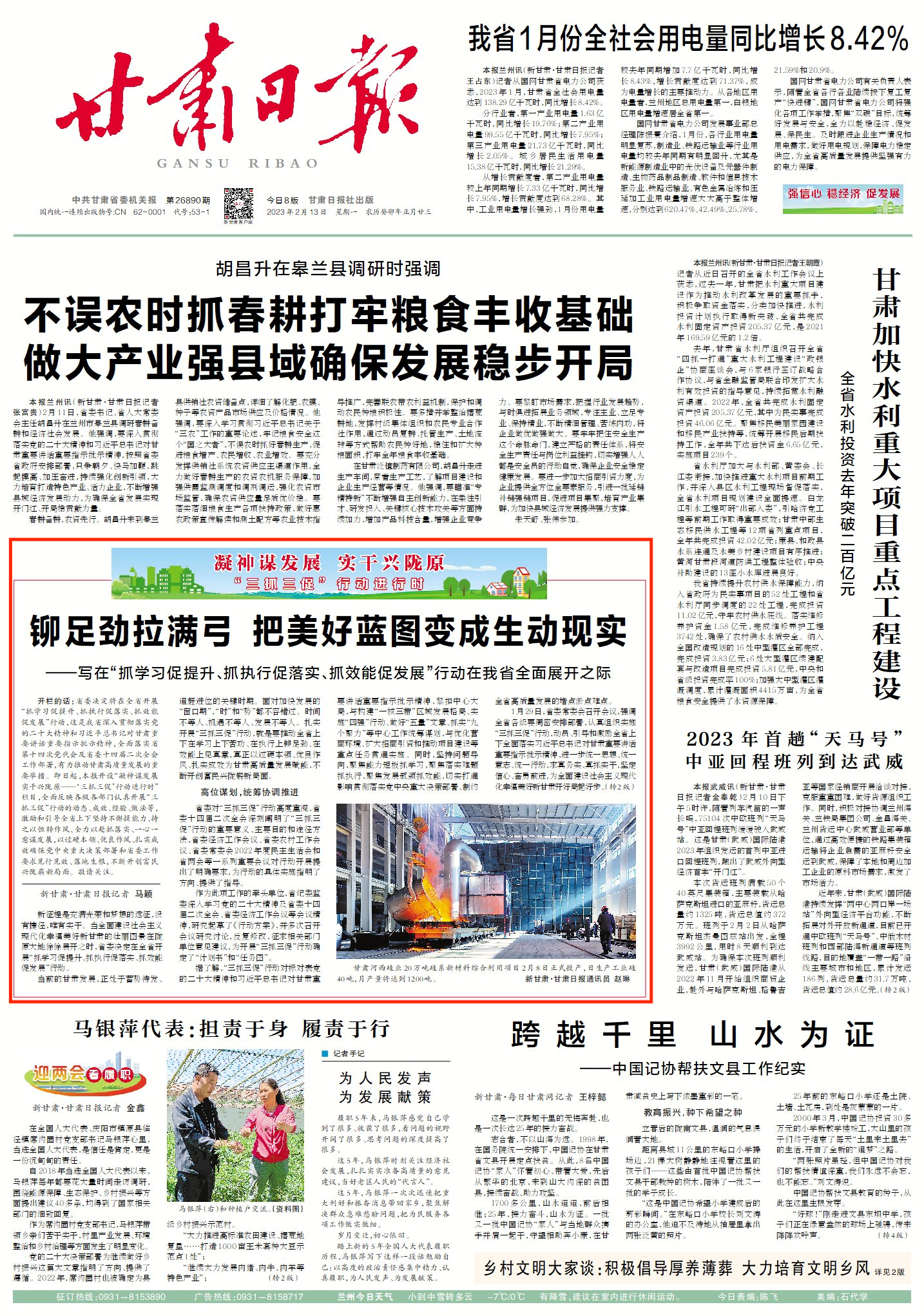 开栏的话:省委决定将在全省开展“抓学习促提升、抓执行促落实、抓效能促发展”行动,这是我省深入贯彻落实党的二十大精神和习近平总书记对甘肃重要讲话重要指示批示精神,全面落实省第十四次党代会及省委十四届二次全会工作部署,有力推动甘肃高质量发展的重要举措。即日起,本报开设“凝神谋发展 实干兴陇原——‘三抓三促’行动进行时”栏目,全面反映各级各部门认真开展“三抓三促”行动的动态、成效、经验、做法等,激励和引导全省上下坚持不懈提能力、持之以恒转作风、全力以赴抓落实、一心一意谋发展,以过硬本领、优良作风、扎实成效确保党中央重大决策部署和省委工作要求见行见效、落地生根,不断开创富民兴陇崭新局面。敬请关注。