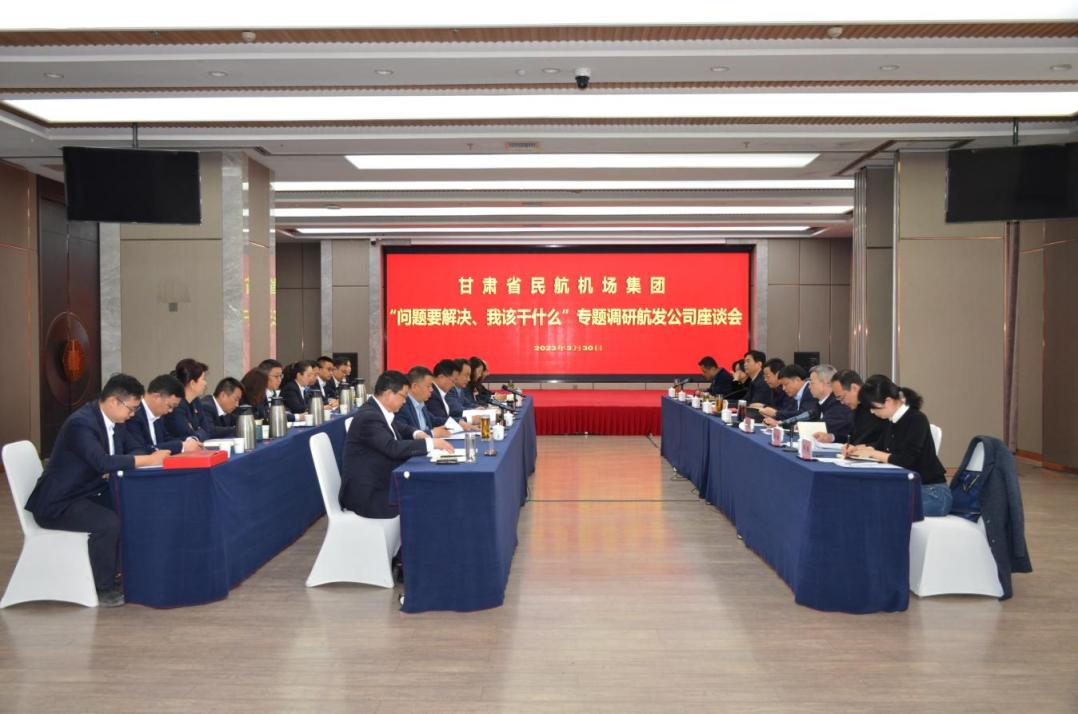 3月30日上午8:30分,省民航机场集团党委书记、董事长席必泽,党委副书记、总经理罗斌带领集团调研组一行8人莅临航空发展公司开展“问题要解决、我该干什么”专题调研工作。会议由席必泽董事长主持,航发公司领导班子成员、机关各部门、各子公司、各酒店负责人及职工代表共计26人参加了调研座谈。