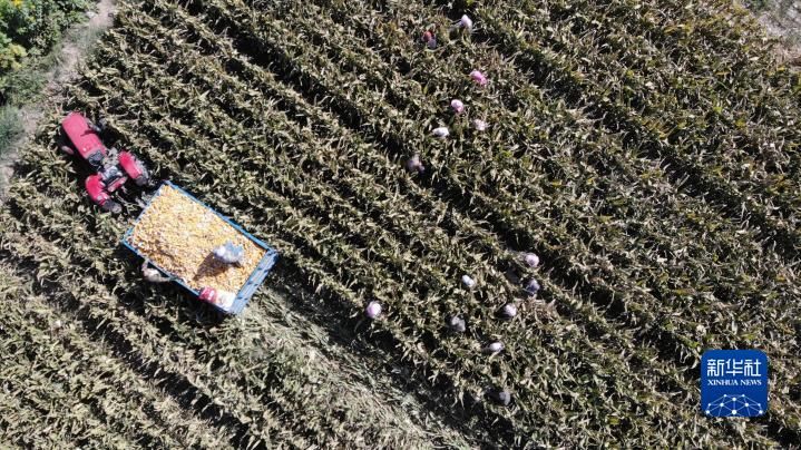 甘肃省张掖市甘州区甘浚镇拍摄的玉米种子收获场景(无人机照片)。新华社记者 王朋 摄