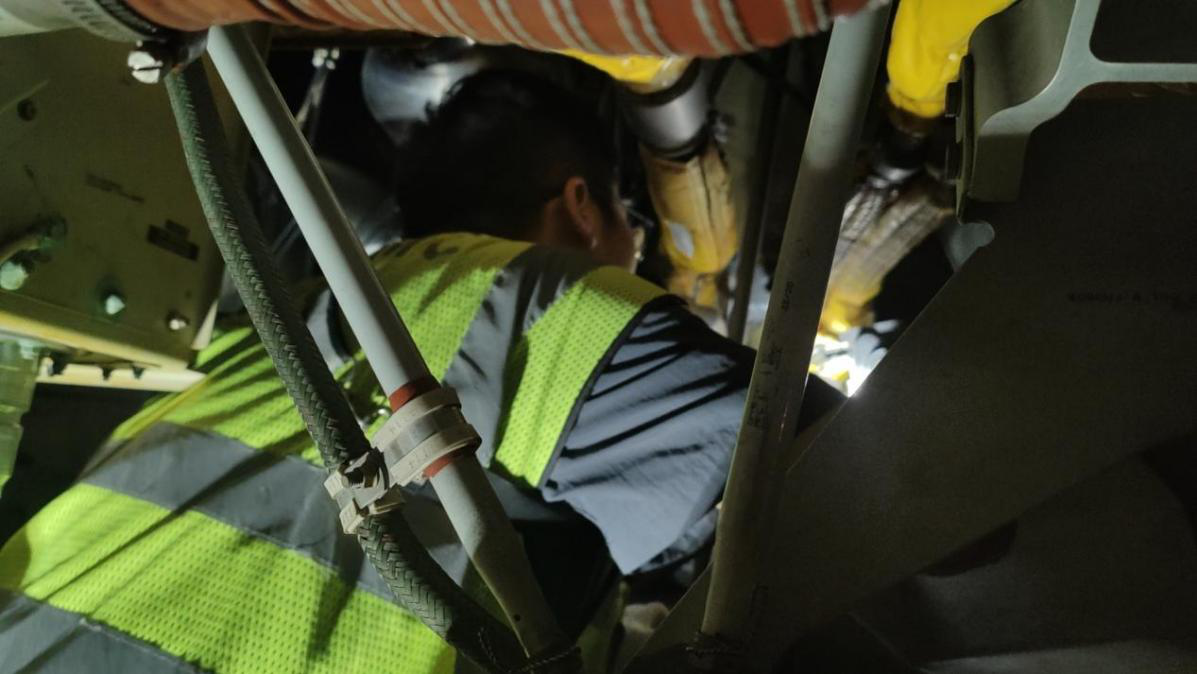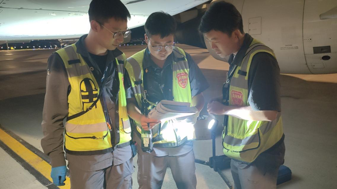 随着夜幕降临,排故工作拉开序幕,团队成员紧密协作,克服了时间紧迫、任务繁重等多重困难。他们凭借过硬的专业技能和严谨的工作态度,最终于凌晨4点左右完成了所有维修与测试工作,确保了飞机安全出港,也为暑运期间的航空运输安全提供了有力保障。