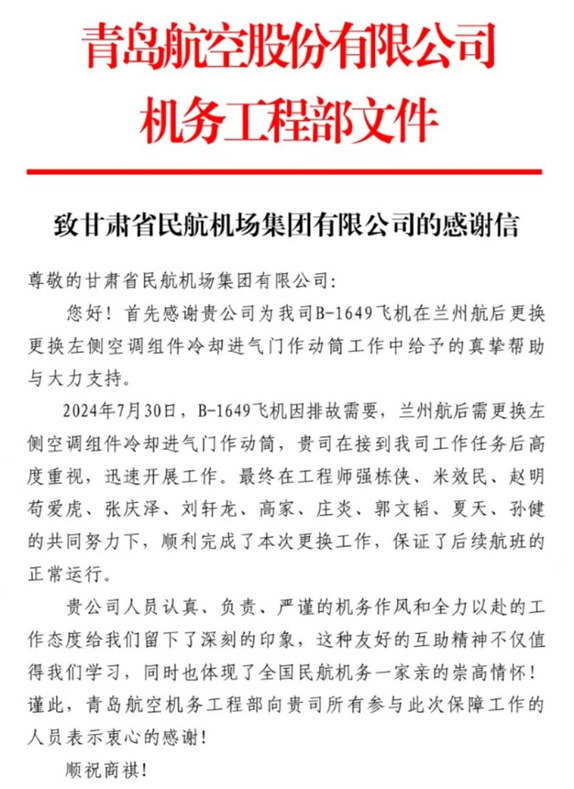 青岛航空对兰州维修部二车间的出色表现给予了高度评价,并致以感谢信。