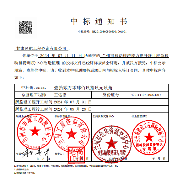 7月11日,甘肃民航工程咨询有限公司中标兰州市移动排涝能力提升项目应急移动排涝调度中心改造工程监理项目,中标金额12.04999万元。
