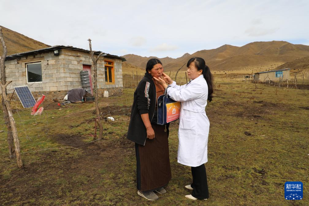 王蒋艳为牧民索南草测量血压。新华社记者 梁军 摄