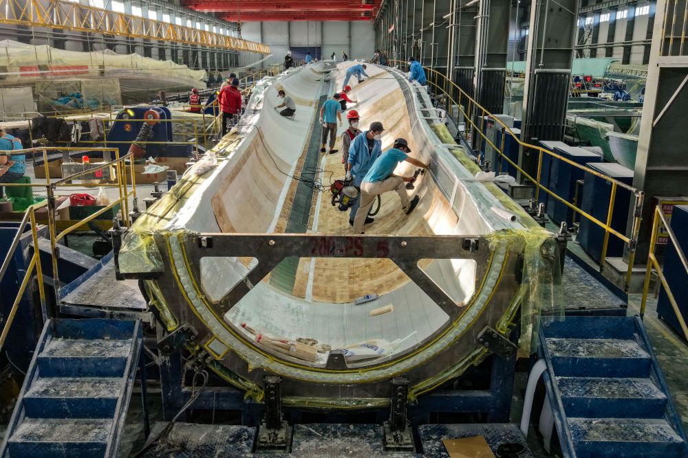 在甘肃省酒泉经济技术开发区的甘肃九鼎风电复合材料有限公司成型车间,工作人员进行风机叶片铺层作业(无人机照片)。新华社记者郎兵兵 摄