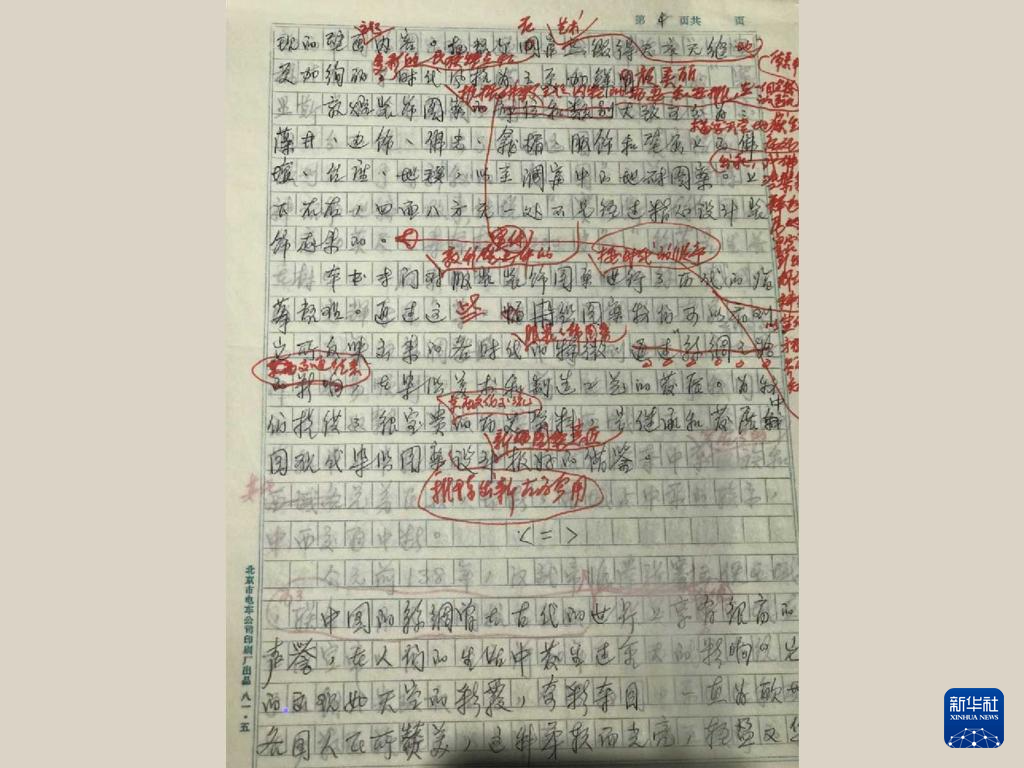 《敦煌历代服饰图案》手稿,红色笔记为常书鸿修改痕迹(资料照片)。新华社记者 张玉洁 摄