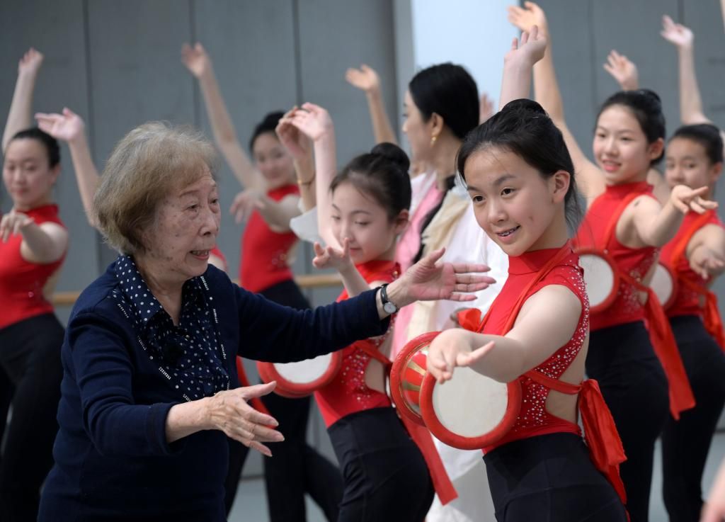 高金荣为学生指点敦煌舞动作要领。新华社发(裴鑫 摄)
